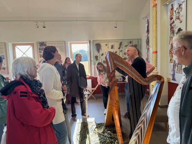 Das zeigte sich besonders bei dem Programm „Die Magie der Keltische Harfe". Trotz des schlechten Wetters kamen viele Besucher zu dem Konzert, so das die Sitzplätze nicht ausreichten und die zuletzt gekommenen Musikbegeisterten stehend lauschten. Peter Wucherpfennig, Harfenist in der Tradition der irischen Barden, Poeten und Geschichtenerzähler, konzertierte nicht nur auf einer modernen Darmsaitenharfe. Kontrastreich entlockte er auch der historischen Harfe, einem Instrument mit Saiten aus Bronze und einem glockenähnlichen Klang, alte irische Weisen.